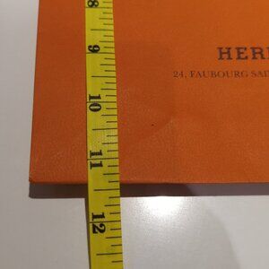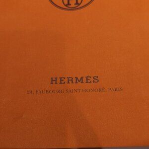 Elegant shopping bag in a vibrant orange color. Perfect for carrying essentials with style. Material is a sturdy cardstock with a rope handle and tied with Hermes ribbon.