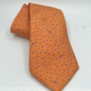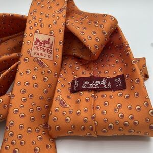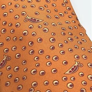 Authentic Hermes 100% silk tie. Orange base with peapod and black-eyed pea pattern. A classic look with a bit of whimsy.