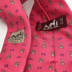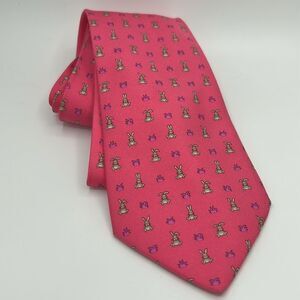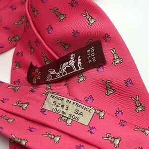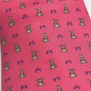 Hermes Charming pink silk tie adorned with a whimsical bunny pattern. Ideal for adding a playful touch to your attire.