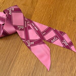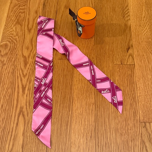 Elegant Hermes twilly scarf. Features pink design. Perfect for adding a touch of luxury.
