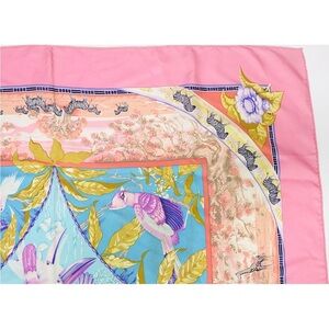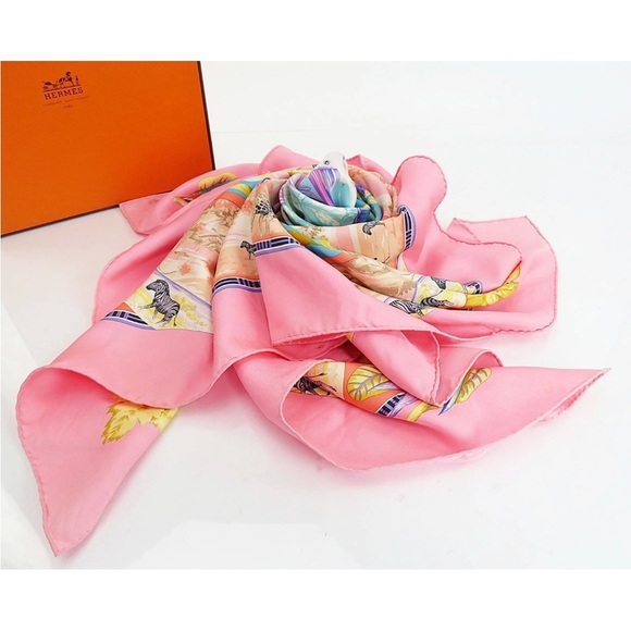 Chic Hermes scarf in vibrant pink with multicolor accents. Adds a stylish flair to any ensemble.
