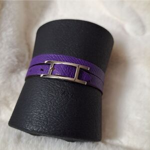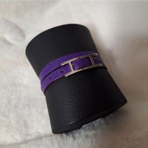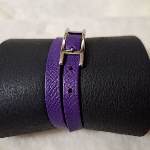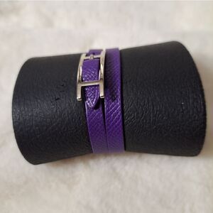 Elegant purple leather bracelet. Features iconic silver clasp. Perfect for any occasion.