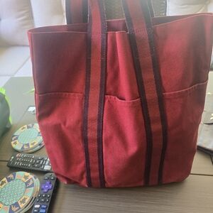 Stylish red canvas tote bag featuring bold black stripes. Perfect for everyday use.