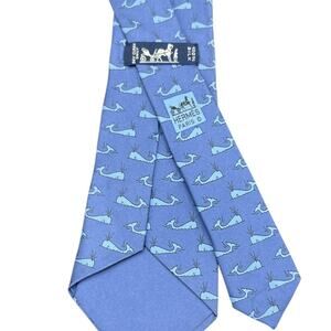 Preowned HERMÈS Royal Blue & Off-White Whale Ocean Print Silk Necktie 7294 EA