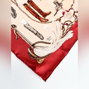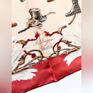 Hermes silk pocket square in the A Propos de Bottes pattern, originally designed by Xavier De Poret in 1962. This design depicts riding boots and other equestriana in neutral shades against a cream ground and burgundy border. The artist garnered attention for his early drawings of horses, birds and other animals and made a name for himself as a major portrait artist, having been commissioned to create a portrait of HM Queen Elizabeth II. The piece is finished with hand-rolled and stitched edges.