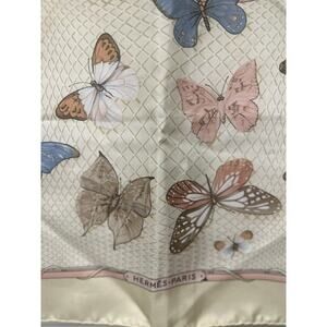 Elevate your ensemble with the timeless elegance of the Hermes Farandole Silk Scarf. Crafted from luxurious silk, this signature Hermes scarf showcases the iconic 'Farandole' print, featuring exquisite butterflies and flowers across its surface. This scarf is a versatile accessory that can be styled in infinite ways. Whether draped elegantly around the neck, tied as a headscarf, or even worn as a statement belt, this Hermes scarf adds a touch of refinement to any outfit. Embrace the timeless allure of Hermes with the Farandole Silk Scarf, a versatile accessory that effortlessly exudes sophistication and femininity in every style. Style this as a head scarf paired with a Missoni dress and a Chanel tote bag to complete the look. In excellent condition, please see photos and video. Approximate measurements: 90CM.