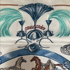 Elegant silk scarf featuring an equestrian theme with horses and riding gear. Dominant colors include blue, orange, and white.