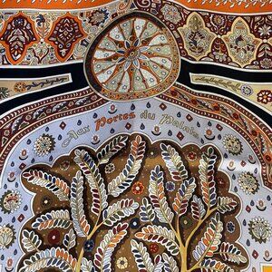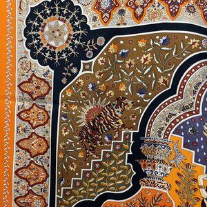 35" by 35" The motif in Hermes Orange and accents of Blue and Periwinkle.