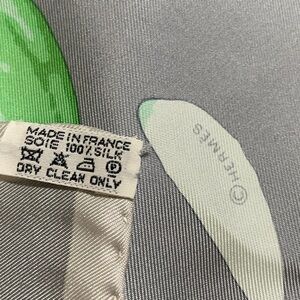 Luxurious Hermes scarf. Features gray and green design. Made of 100% silk.