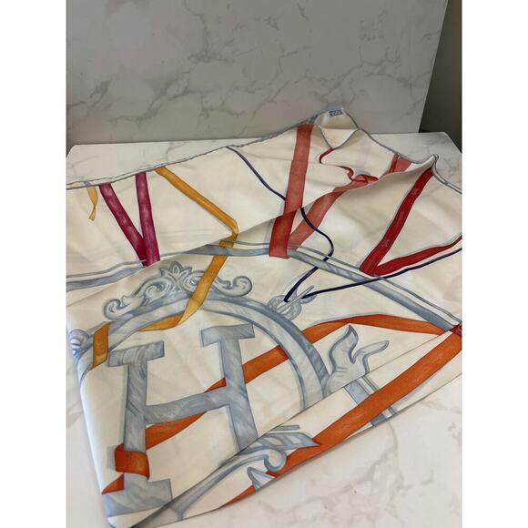 This Hermes silk scarf features a beautiful multi-color design with intricate patterns. Despite some makeup marks, it remains in great condition and is a chic accessory to elevate any outfit. Perfect for adding a touch of luxury and style.