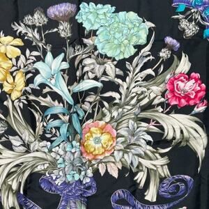Exquisite hues of blue, pink bouquet of flowers on the black background Magnificent scarf and silk print.