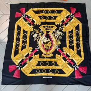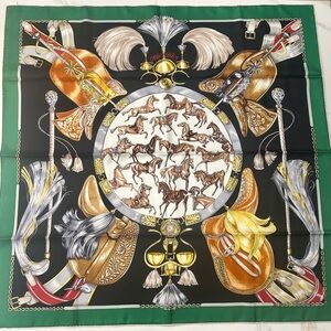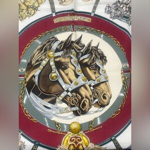 Authentic Hermès Paris silk carré scarf titled “Chevaux de Trait”, designed by Laurence Bourthoumieux (Toutsy). This classic Hermès design celebrates draft horses and equestrian harness motifs, a hallmark of the maison’s heritage.