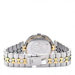 This beautiful Hermes watch is crafted from two-tone Stainless-Steel and features a quartz movement with a date complication, white dial, smooth bezel, and link bracelent with hook-and-latch-clasp. There is green tarninsh in between the bezel. Only visible when really close-up. Not visible on your wrist.