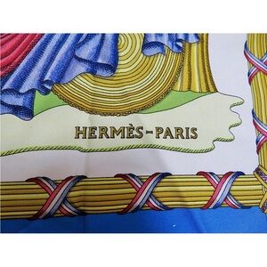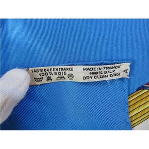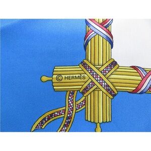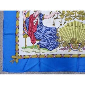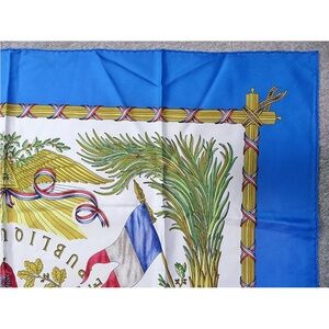 Luxurious silk scarf with a tricolor and gold motif. Features intricate emblem and artistic details.