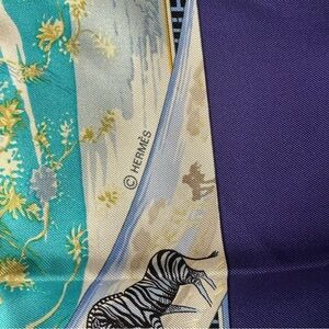 Vibrant Hermes 100% silk Tropiques scarf featuring birds, zebras, giraffes and floral design. Rich colors include purple, green, and blue. Hand rolled edges.