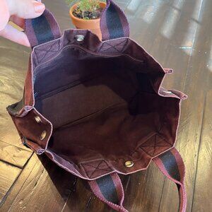AUTHENTIC Black Hermès Paris canvas tote bag with contrasting burgundy trim/sides and snap-button closure.