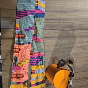 Elevate your style with this Hermes silk scarf. Features bold orange and blue patterns. A chic accessory for any outfit.