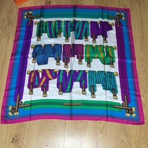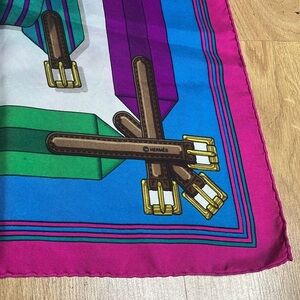 This is a beautiful Hermes Vintage J. Metz 90cm 33” J. Les Sangles 100% Silk Scarf w/Bag. There is a spot as pictured. No odors. No stains.