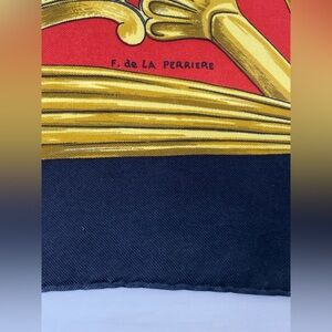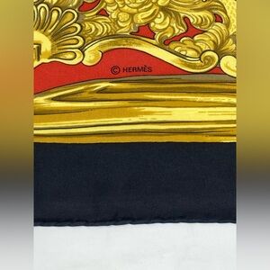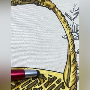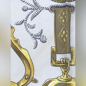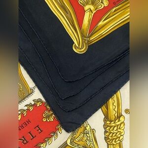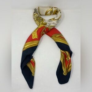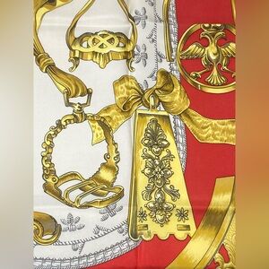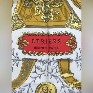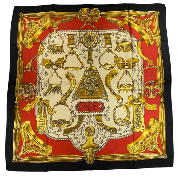 Beautiful vintage Hermès scarf featuring ornate equestrian stirrups in shades of gold on a cream and red background, finished with a black border.
