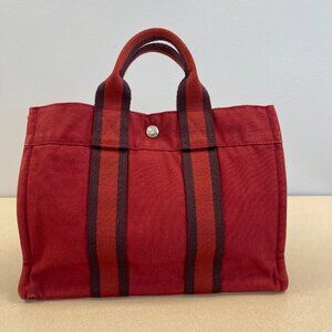 Hermes Vintage Fourre Tout PM Bordeaux Red w/ Black Stripe Canvas Tote - Preowned