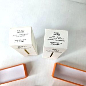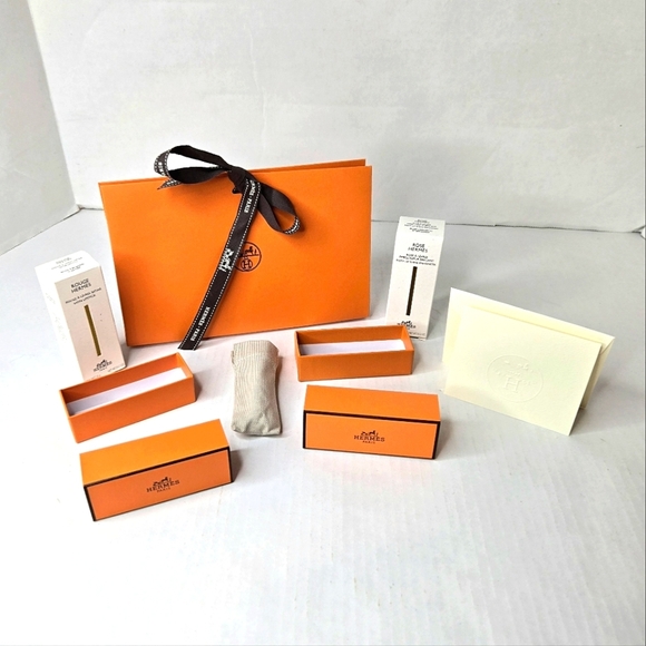 Hermes bundle of 2 lip color outer boxes; 2 lip color inner orange logo boxes; 1 lip color dust bag, 1 blank small note card with matching envelope; 1 logo orange paper, accordion style, heavy duty envelope with ribbon closure.