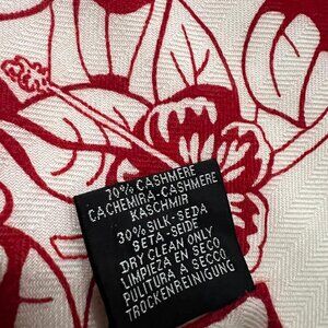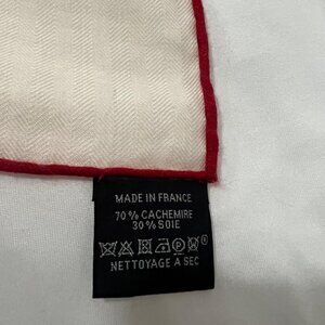 Designed in a striking deep red/burgundy illustration on a cream/off-white background, this shawl exemplifies Hermès’ renowned craftsmanship and artistry.