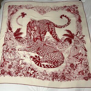 Authentic Hermès Paris shawl crafted in a luxurious 70% cashmere / 30% silk blend, offering exceptional softness, warmth, and an elegant drape. This stunning piece features the iconic “Single Love” jungle motif, with two leopards set in a richly detailed tropical scene surrounded by flora, birds, and butterflies.