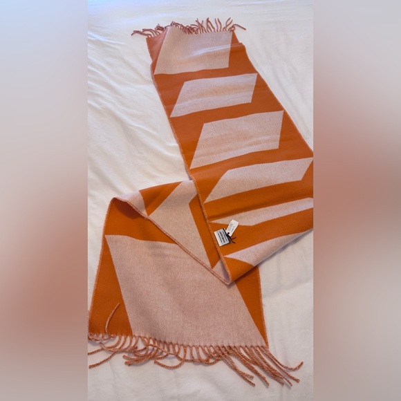 geometric shapes, orange cashmere Hermes casaque scarf. never worn, perfect condition with tags, box, and ribbon.