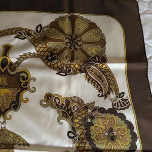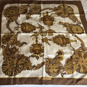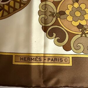 Hermes carre 90 Cendrillon silk scarf with box. Colors are brown, gold, green on cream background.