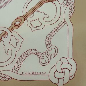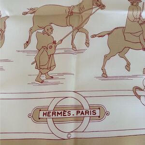 Elegant Hermes scarf with equestrian design. Features beige and cream tones. Luxurious silk material.
