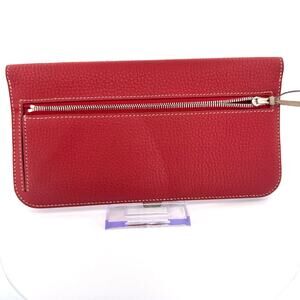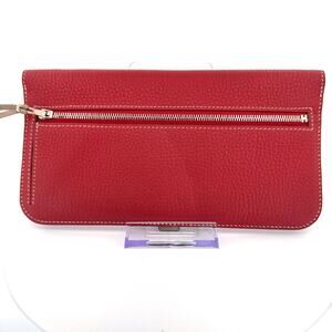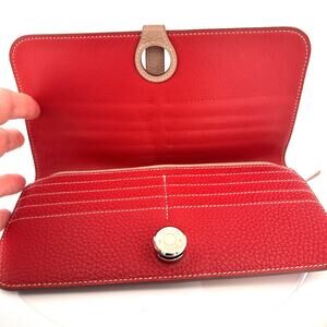 A timeless expression of French craftsmanship, this authentic Hermès Béarn Wallet is crafted from supple Togo leather in striking Rouge Casaque red with contrasting Etoupe tab closure. The wallet features a signature “H” clasp in palladium hardware and immaculate white saddle stitching, opening to a beautifully organized interior with multiple card slots and compartments. A refined and luxurious essential for any Hermès collector.