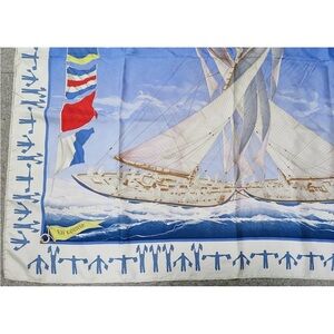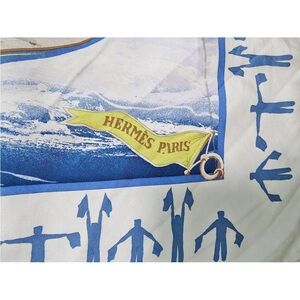 Chic Hermès scarf featuring blue and yellow design. Luxurious silk material.