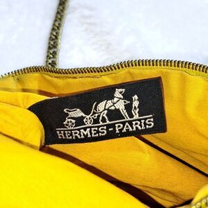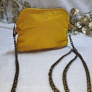 Super adorable little pouchette. Comes with an unbranded chain so you can carry it or you can remove the chain and keep the pouchette in your bag. Perfect for carrying all the important things. Yellow canvas outside with a zipper across the top. Tabs on each side to attach a strap/chain to. Leather binding along the bottom is in great condition. There is a few minor spots on outside of the bag, please see photos. Inside is in like new condition.