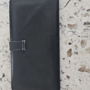 Zipper coin pocket, 2 bill compartments, card slots, 2 open pockets.