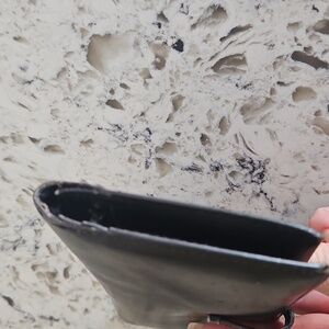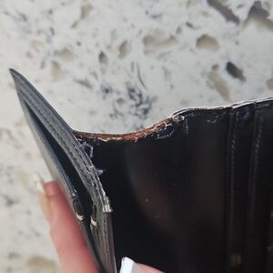 Callouts: corner rubbing and separation in one side, zipper pull inside the pocket is missing, minor signs of scratches and wear on the leather and hardware.