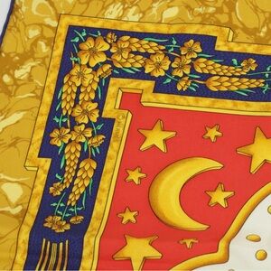 Vibrant silk scarf featuring a sunburst design. Rich colors include gold, purple, blue, and red. Hermès "Carpe Diem" Multicolor Silk Twill Scarf 90