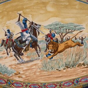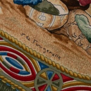 This exquisite Hermès “Cavaliers Peuls” scarf (translating to Fulani Horsemen) is a remarkable design by Jean de Fougerolle, first issued in 1993. Richly illustrated with scenes of Fulani horsemen, wildlife, village life, and ceremonial processions, this carré captures the vibrant culture and heritage of the Sahel region.
