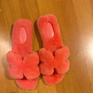 Elegant Hermès slippers in a striking coral hue. Soft texture for cozy wear.