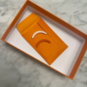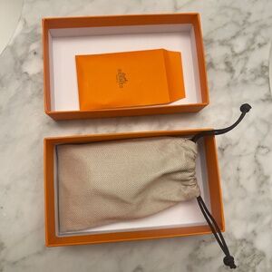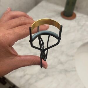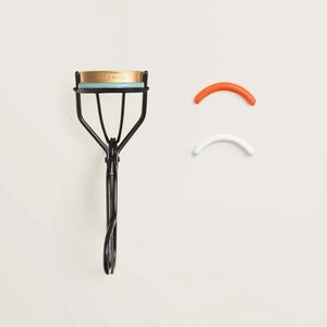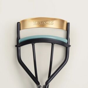 This portable and durable object in matte black metal is engraved with the tone-on-tone Hermès signature on the golden band. Protected by a canvas pouch and an orange box, Le Courbe-cils comes with three replaceable pads: white, blue and orange.