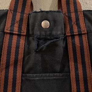 The bag is made of canvas and features striped top handles and multiple exterior slip pockets. Interior is fully canvas with a zip pocket. Zipper operates smoothly.