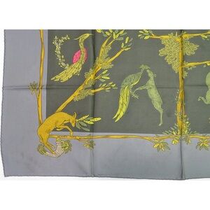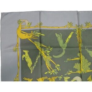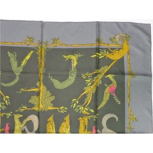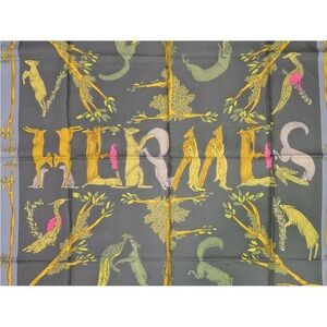 Elegant Hermès silk scarf featuring gray and yellow tones with artistic design.