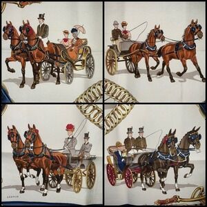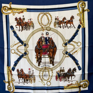 Equipages is a classic Hermès carre by favorite artist and illustrator, Philippe Ledoux, which was first issued in 1973 and features Hermes' trademark equestrian theme