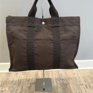 Fabulous Hermès Herline Tote in Dark Gray. Overall condition is excellent, but used. No flaws noted other than typical light scratching on silverware.