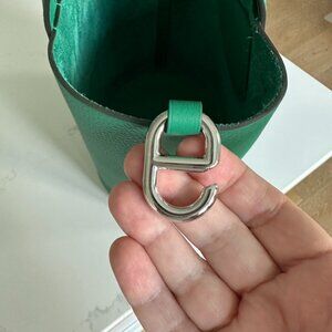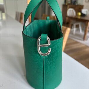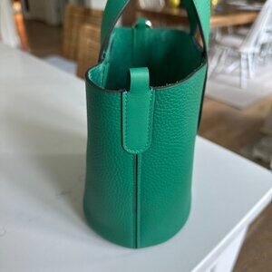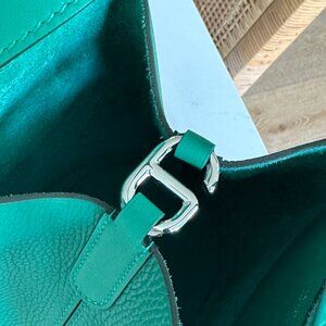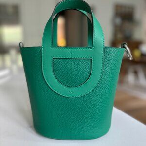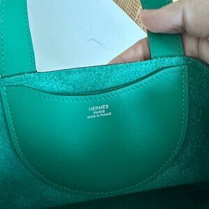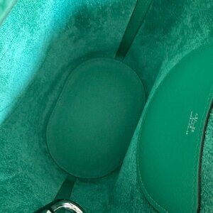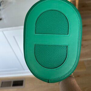 In the Loop 18 cm in spectacular Vert Vertigo, arguably Hermès' best green. Palladium hardware closure. The softest clemence leather. The leather smells AMAZING. If you know, you know. Absolutely gorgeous, brand new, box fresh with receipt. Purchased MAY 2025 at 24 Faubourg by me personally while on vacation in Paris. The bag has been stored in the canvas bag in its box. Ironically, I've just been offered a special bag that is close in color to this In the Loop, so I need to sell this.