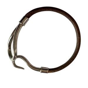 Hermes jumbo leather hook-wrap bangle bracelet. Brown with silver hardware. Hermès stamped on edge of hook near end. Palladium-Plated & Leather