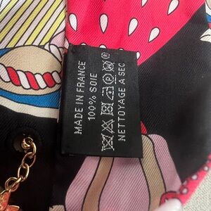 Vibrant Hermès Paris silk scarf with a playful design. Features blue, red, and white colors.
