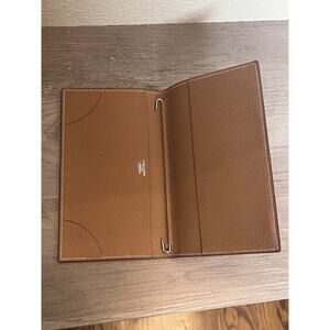Authentic Hermès camel-colored leather notebook holder. Beautiful, smooth leather with classic Hermès craftsmanship. Perfect for planners, notebooks, or small documents. Minor signs of wear from gentle use — overall very good condition.