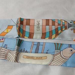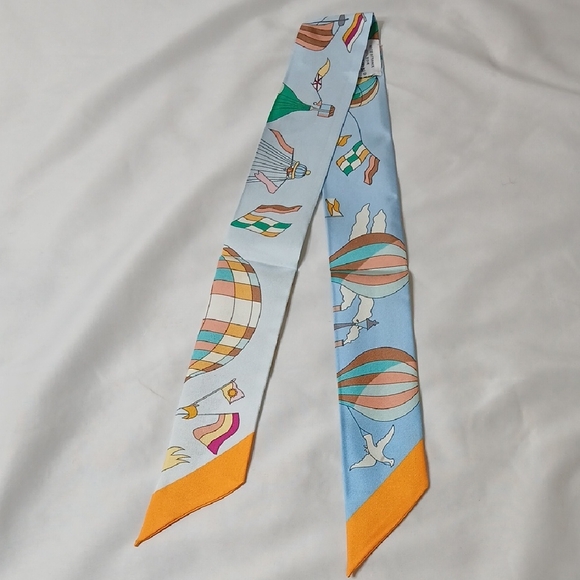Elegant Hermes twilly scarf. Features sky blue background with orange accents. Balloon and bird motifs add charm.