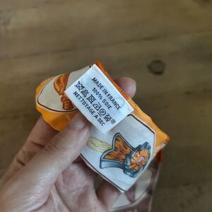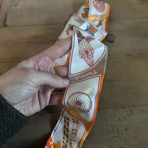 Stylish Hermès twilly scarf in orange and white. Features playful designs.