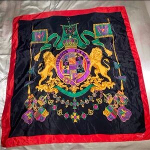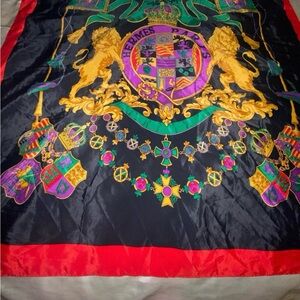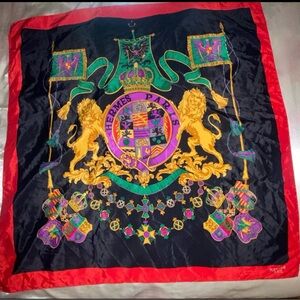 Elegant Hermès Paris silk scarf featuring a vibrant crest design. Rich black and red colors with intricate details. excellent condition no flaws